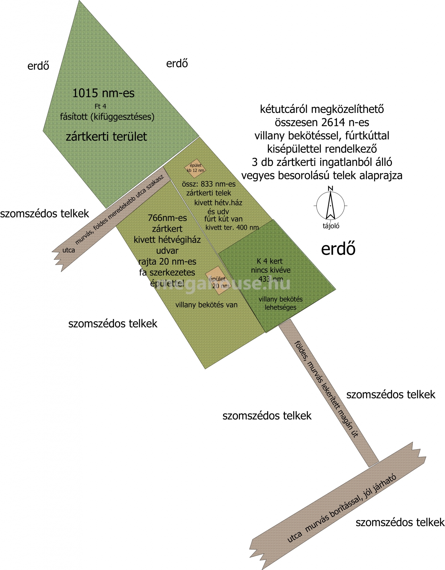 2614 m² területű, 3 kisebb telekből (1015nm, 766nm, 833nm) álló ingatlan.