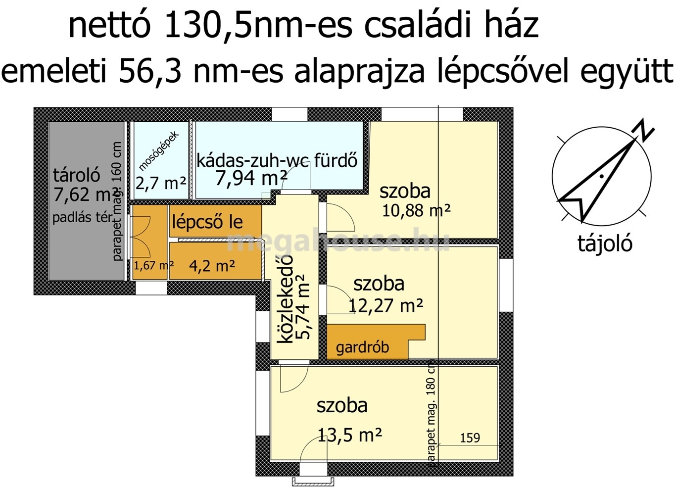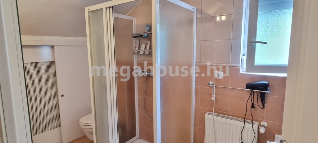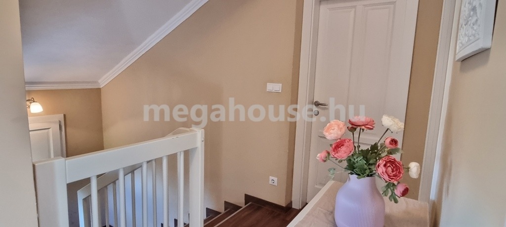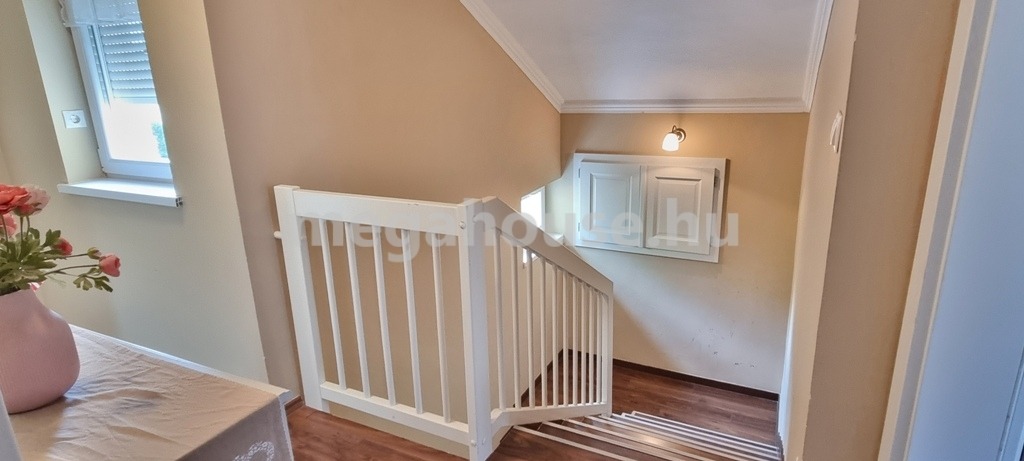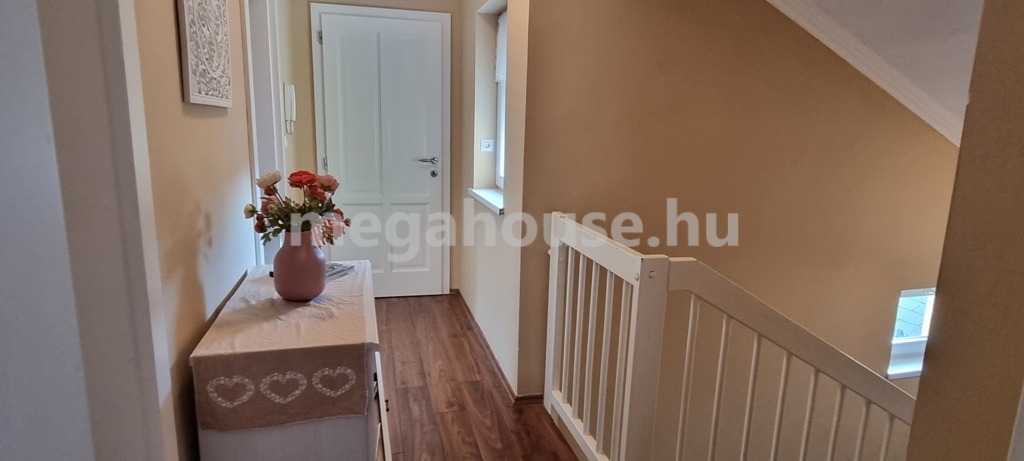 A kényelmes és meleg burkolattal ellátott lépcsőn az emeleti szintre érkezve a tágas közlekedőből nyílnak a szobák és a sarok káddal és zuhanyozóval is rendelkező fürdőszoba is. Külön kiemelem a rendkívül hasznos és jól pakolható 10 nm-es tárolót, ami az emeleti lépcsőfordulóból érünk el.