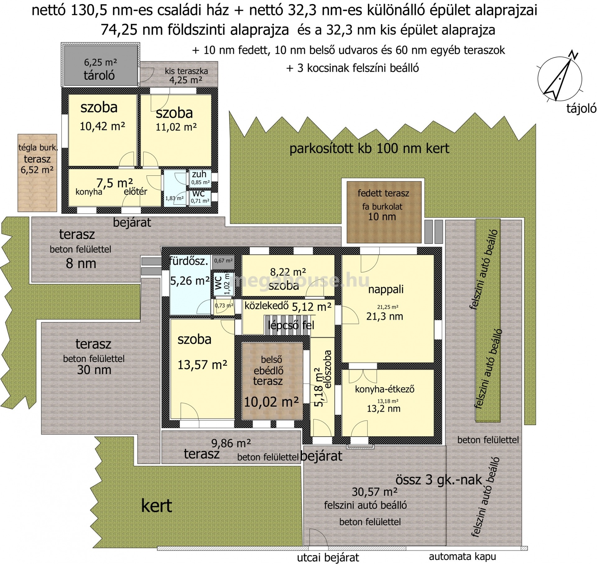 Eltolható és automatizált nagykapu van, kerti csap van. Internet-tv előfizetés több szolgáltatótól is igénybe vehető.