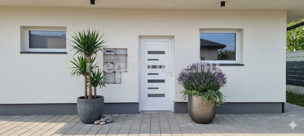 A 30 cm-es tégla falazat 15 cm-es eps hőszigetelést kapott. A lapos tetős kialakítás, ipari hegesztett műanyaglemezes fedéssel a vízszigetelés tökéletes megoldásaként. A födémben 15 cm hőszigetelés is beépítésre került. Korszerű nyílászárók 3 rétegű, dupla thermo kamrás üvegezéssel.