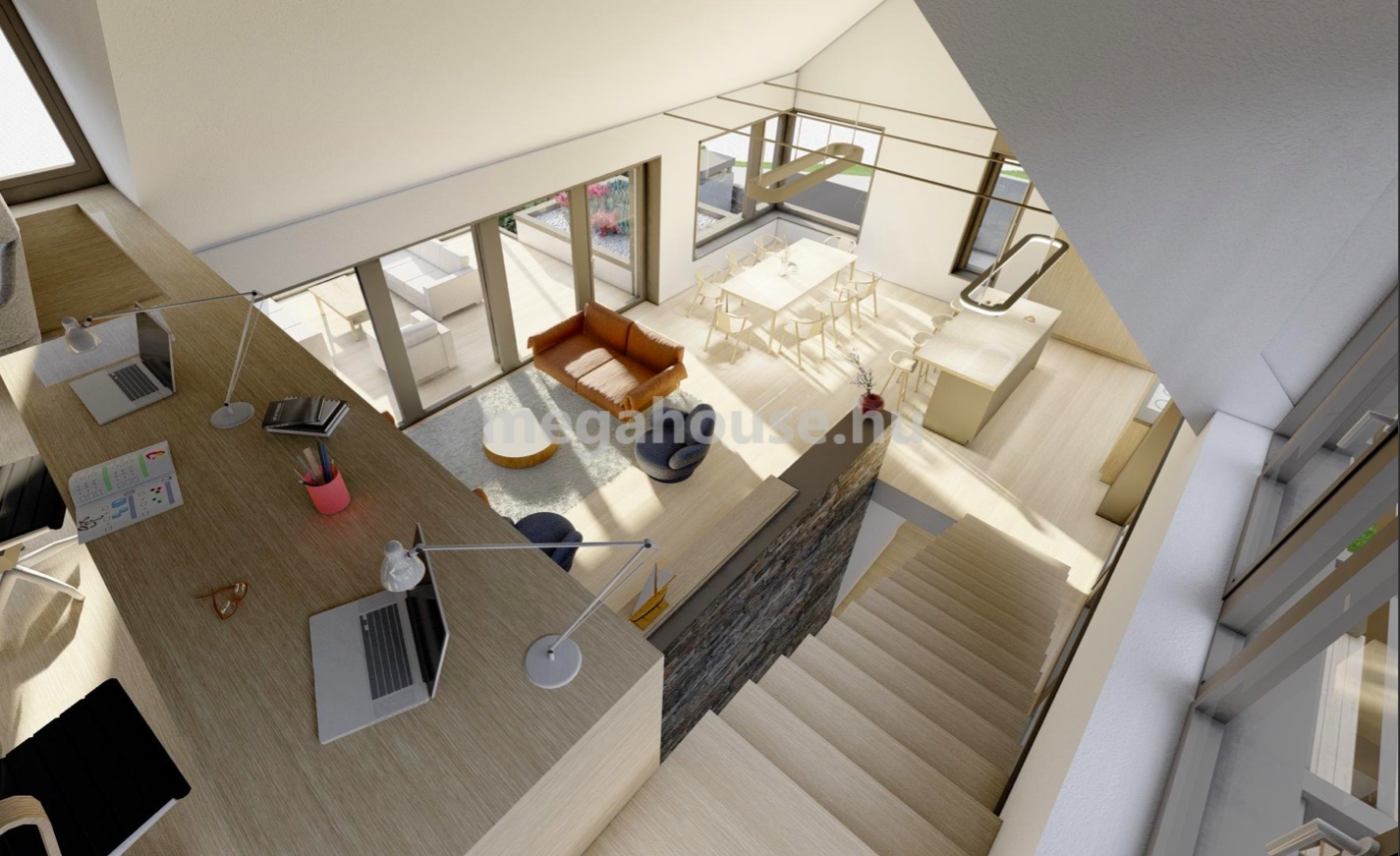 A nappali hatalmas belmagasságának köszönhetően egy jól hasznosítható galéria is kialakításra került. Ennek pontos felosztását a leendő tulajdonos kérésének megfelelően igazítják. Alkalmas lehet dolgozószoba, vagy hálószoba és fürdőszoba, de akár két háló és fürdőszoba kialakítására is.