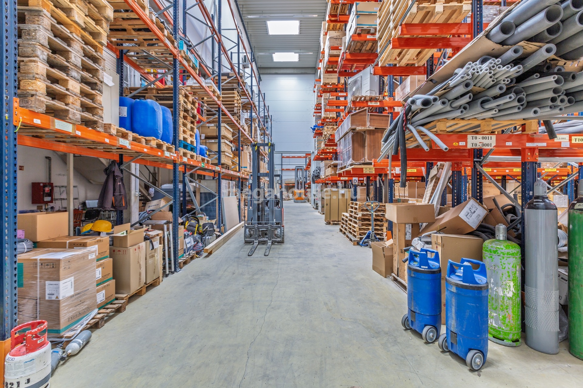 Raklapos áru befogadására optimális 1.200 nm alapterületű, 12.6 m belmagasságú, műgyanta burkolatú, radiátoros temperáló fűtéssel ellátott, magas emelésű targonca rendszerre kiépített állvány rendszerrel rendelkező, 1800-2000 db raklap befogadására alkalmas raktár, amelyhez 29 nm szociális blokk, öltöző tartozik.