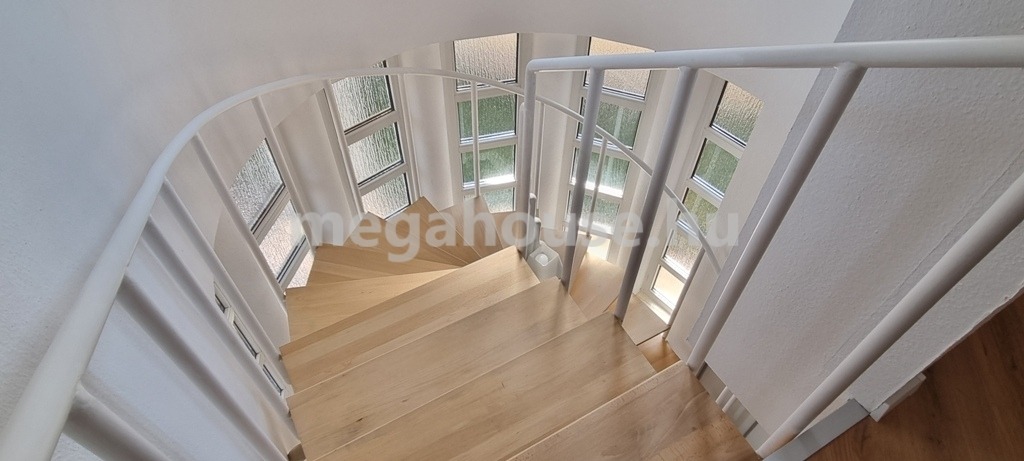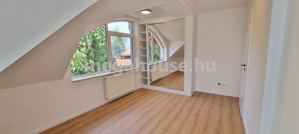 A légies csigalépcsőn jutunk az emelet világos és tágas hálószobáihoz ahol a szennyes ledobóval kiépített kádas-zuhanyozós fürdőszoba mellet külön wc is megtalálható, valamint egy gardrób szoba teljes polcrendszerrel.