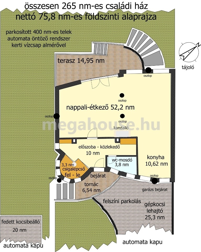 Földszint: lakótér 75,8 nm + 6,54 tornác és 14,95 nm terasz