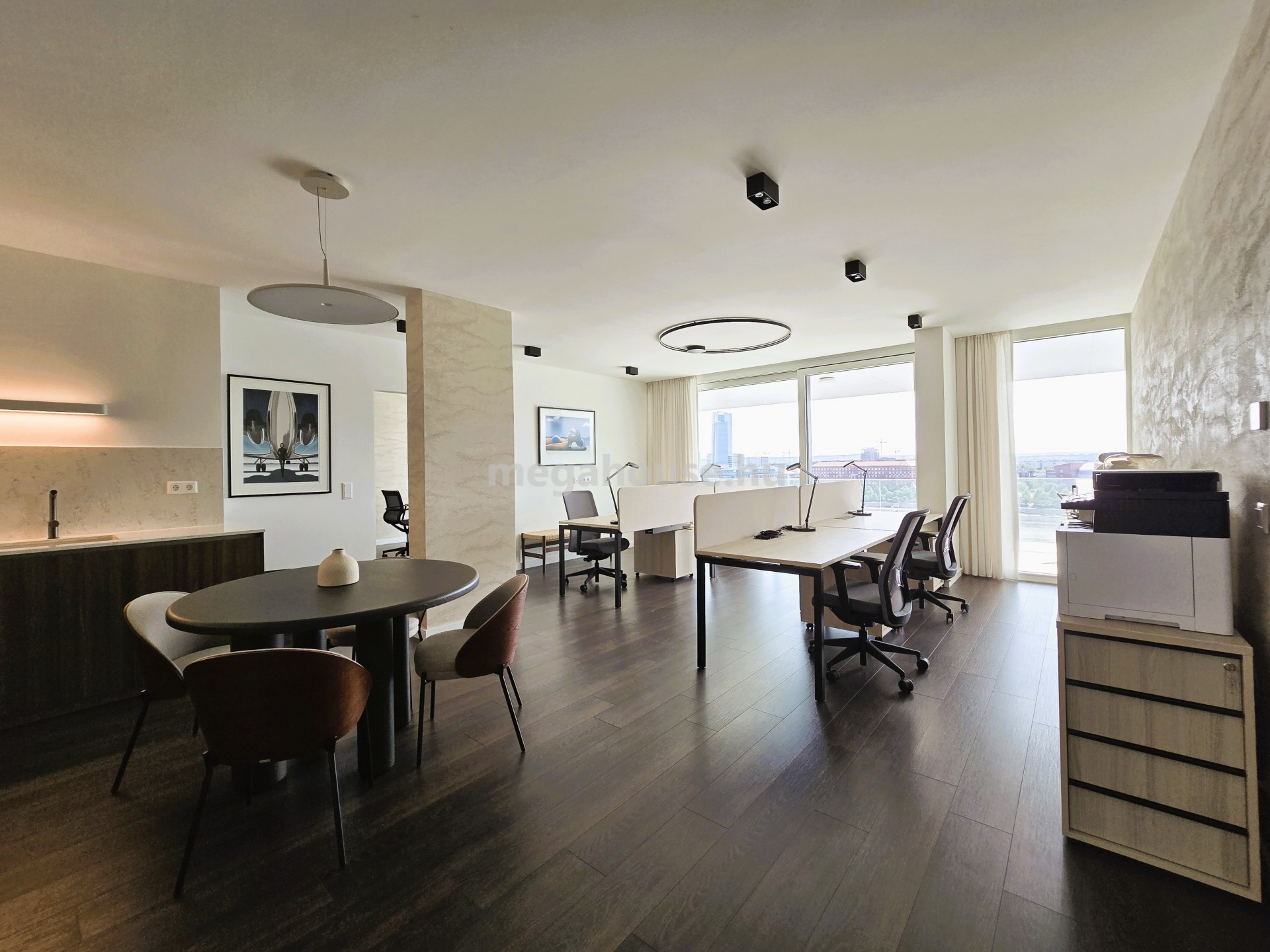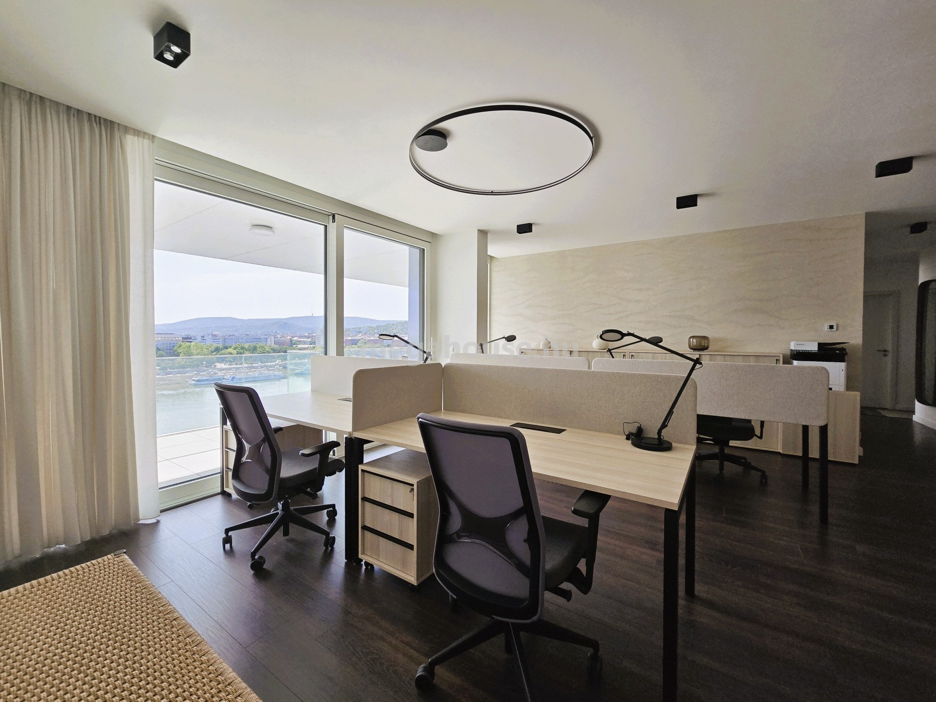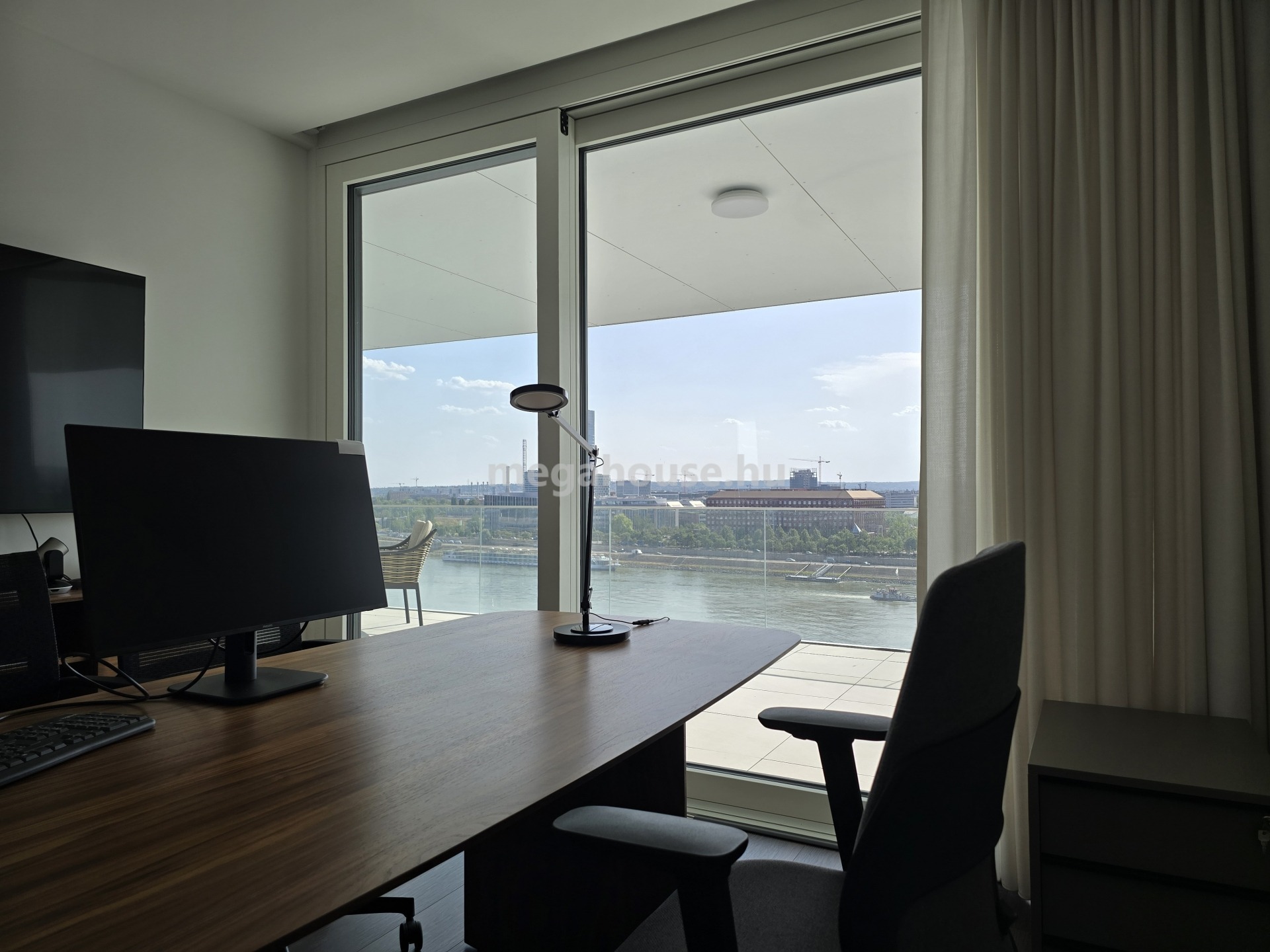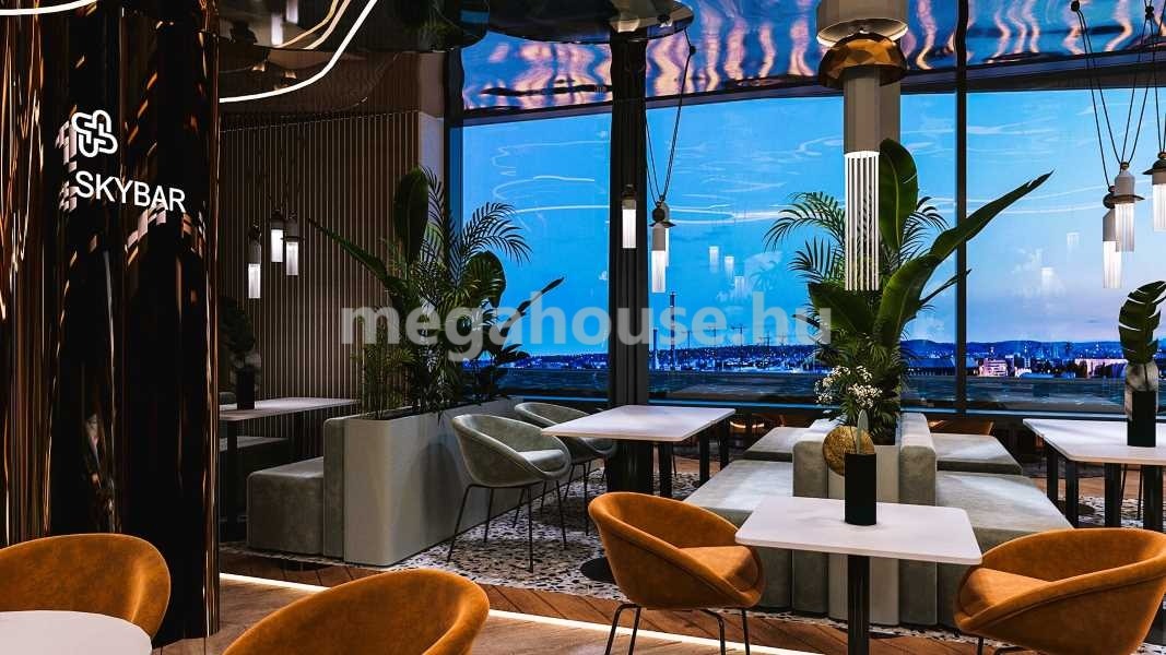 A LIFTES épület 10. emeleten található, nyugati tájolású, természetes fényben úszó lakás előteréből nyílik jobb kéz felől egy tágas fürdőszoba walk-in zuhanykabinnal, bal kéz felől a folyosón a vendég WC kapott helyet. A lakás jelenleg irodaként funkcionál, berendezése is ennek megfelelő. A bejárattal szemben található a vezetői iroda, mellette egy másik szoba helyezkedik el. A lakás központi részén az amerikai konyhás – nappali tér található, amelynek prémium minőségű konyhája MIELE gépekkel felszerelt. A nappaliból nyíló tárgyaló mellett külön helyiségben található a kádas és zuhanyzós fürdőszoba és a mellékhelyiség. A csodaszép dunai panorámával rendelkező terasz szervesen kapcsolódik az ingatlanhoz, gyakorlatilag minden szoba teraszkapcsolatos.