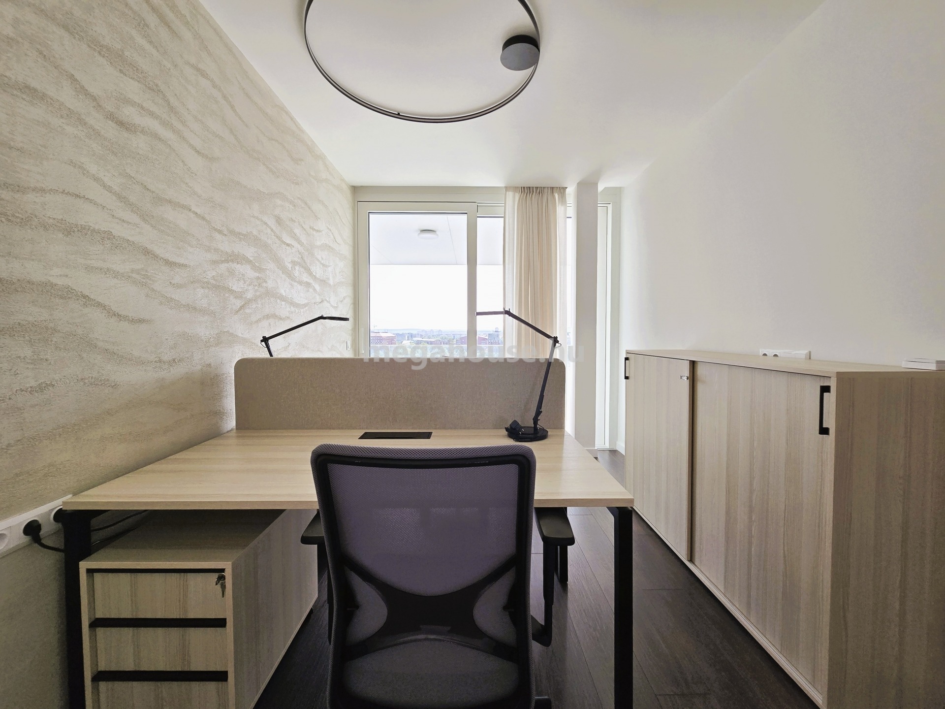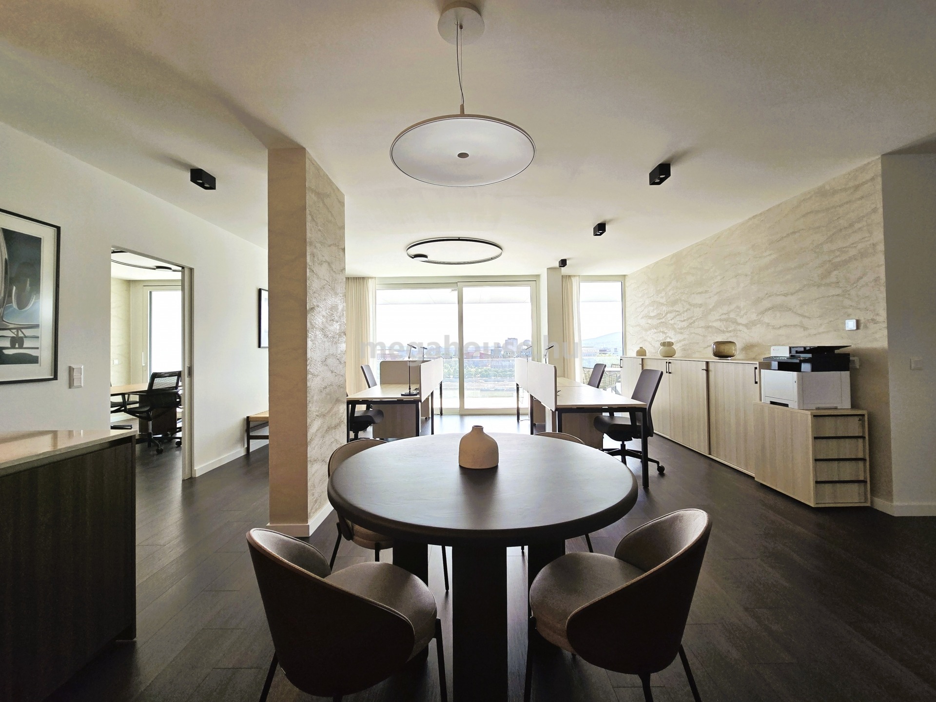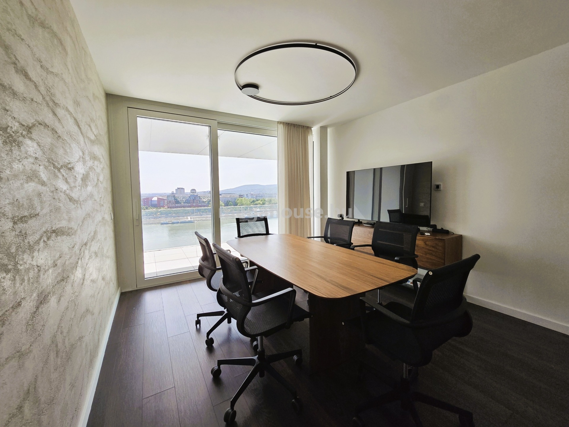 A LIFTES épület 10. emeleten található, nyugati tájolású, természetes fényben úszó lakás előteréből nyílik jobb kéz felől egy tágas fürdőszoba walk-in zuhanykabinnal, bal kéz felől a folyosón a vendég WC kapott helyet. A lakás jelenleg irodaként funkcionál, berendezése is ennek megfelelő. A bejárattal szemben található a vezetői iroda, mellette egy másik szoba helyezkedik el. A lakás központi részén az amerikai konyhás – nappali tér található, amelynek prémium minőségű konyhája MIELE gépekkel felszerelt. A nappaliból nyíló tárgyaló mellett külön helyiségben található a kádas és zuhanyzós fürdőszoba és a mellékhelyiség. A csodaszép dunai panorámával rendelkező terasz szervesen kapcsolódik az ingatlanhoz, gyakorlatilag minden szoba teraszkapcsolatos.