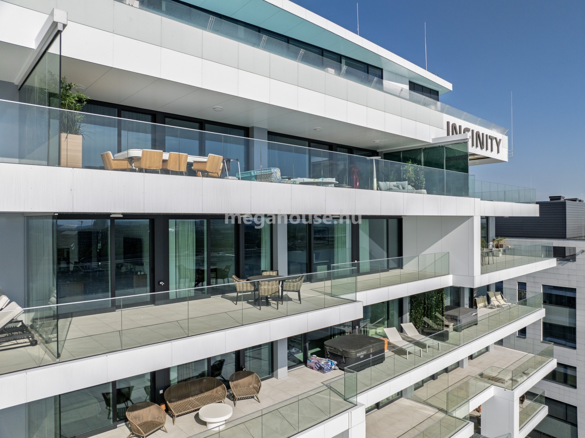 EXKLUZÍV KÖRNYEZETBEN, a prémium minőségű INFINITY épületének 10. emeletén nettó 123 nm alapterületű nappali + 3 szobás lakás közel 50 nm teraszkapcsolattal nettó 7.000 EUR / hó bérleti díj + rezsi költségek mellett kiadó, a 2 kiváló teremgarázshely bérleti díja és a közös költség további 300 EUR / hó.