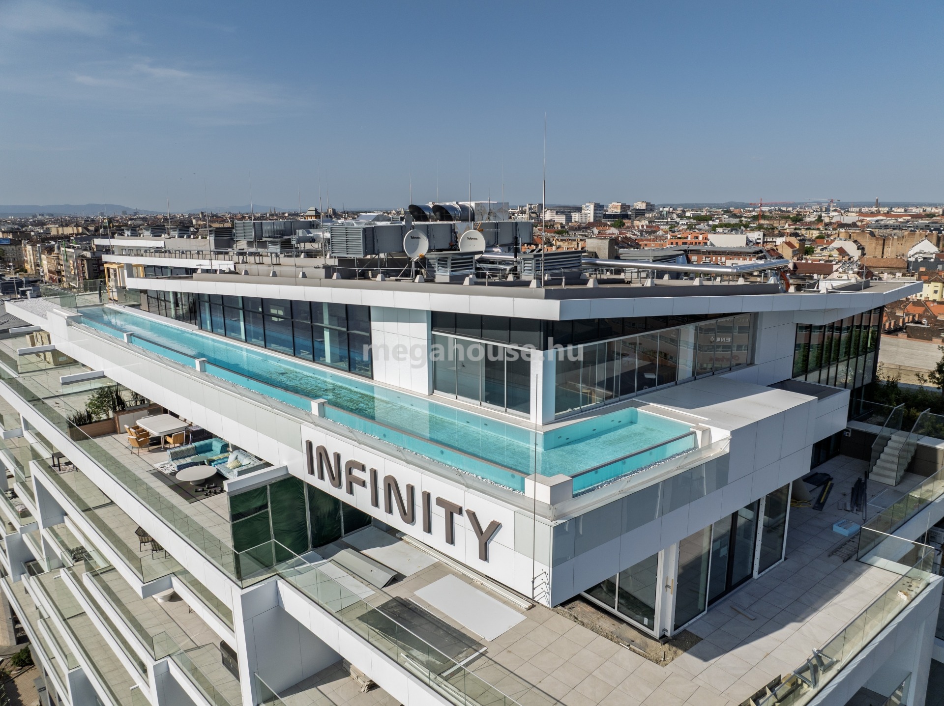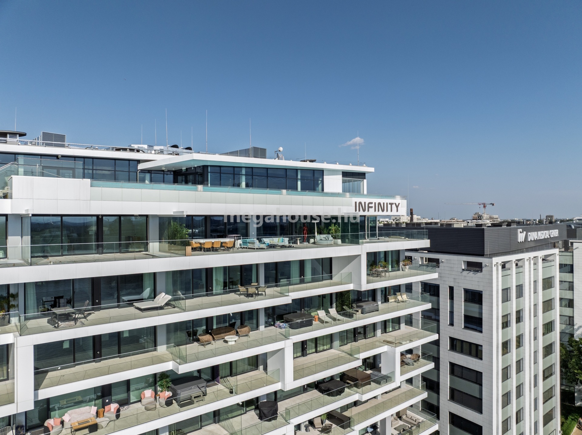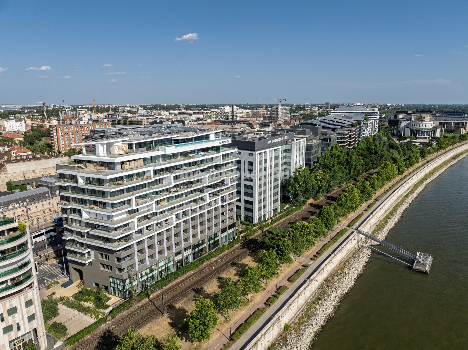 Petőfi híd és Rákóczi híd közötti Duna-parti területen, Budapest legdinamikusabban fejlődő városnegyedében, Millenniumi Városközpont részeként épült meg csúcstechnológiával, a legújabb nemzetközi trendeknek is megfelelő modern designnal e komplexum. Az INFINITY épületében kialakításra került 54 db dunai panorámás luxuslakás esetében, - az épület alsó szintjein elhelyezkedő, közeljövőben megnyíló 4 csillagos superior hotel révén - egyedülálló koncepció valósul meg: a luxushotel szolgáltatási elérhetőek lesznek az itt lakók számára is: többek között SKY BAR üvegfalú medencével a tetőteraszon, szobaszervíz, étterem, kávézó, PANORÁMÁS WELLNESS ÉS FITNESS RÉSZLEG. A többnyire nyugati tájolású lakásokból Közép-Európa egyik különleges nevezetessége, a budapesti Duna-part látképe tárul elénk. A folyóparti elhelyezkedés előnye a lenyűgöző panorámában nyilvánul meg: megcsodálhatjuk a Dunán átívelő hidakat, a Gellért-hegyet a Citadellával és a Szabadság-szoborral, illetve a Budai Vár és a Műszaki Egyetem történelmi épületeit, háttérben a budai hegyekkel.