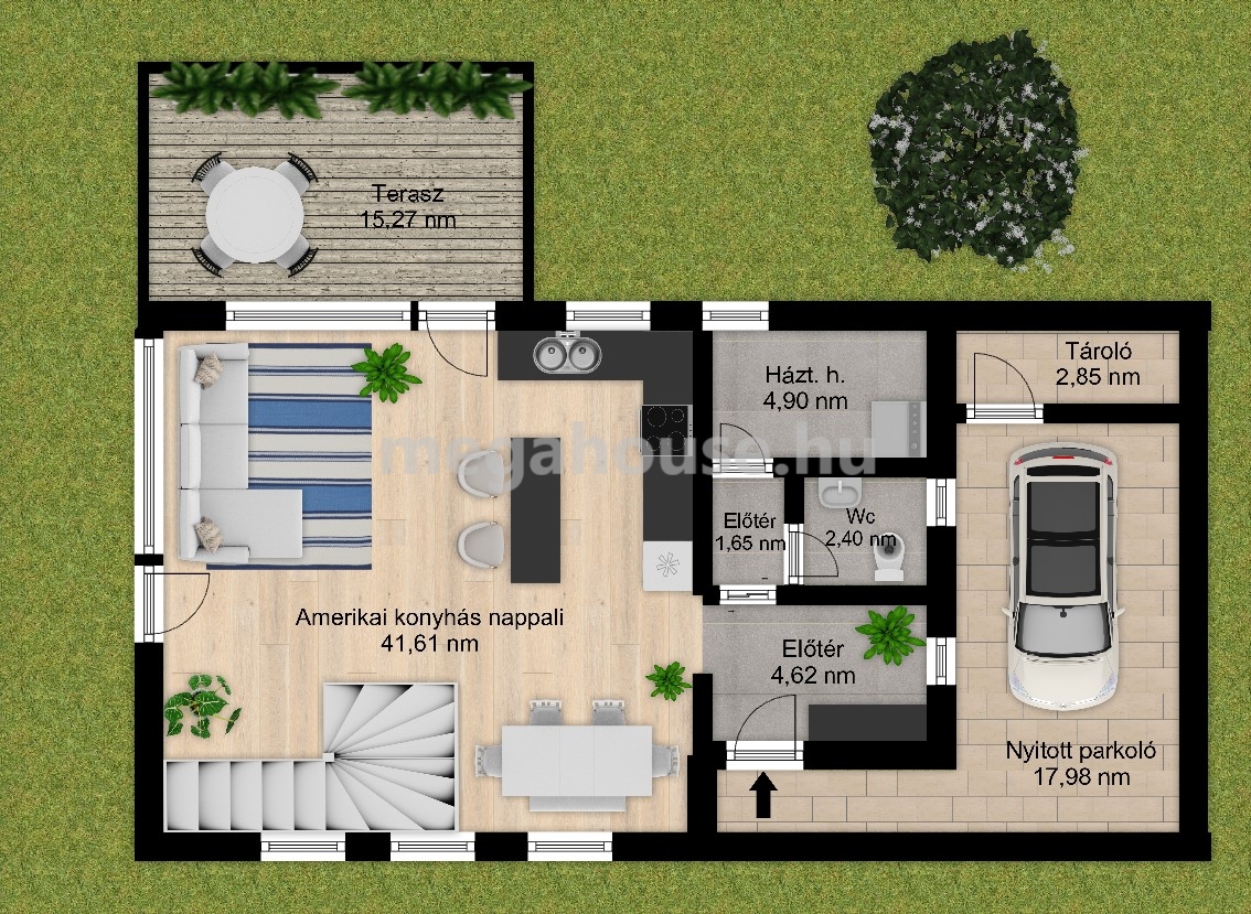 Parking is available in a covered garage, with an additional surface parking space possible. Storage room is available (+10 million HUF).