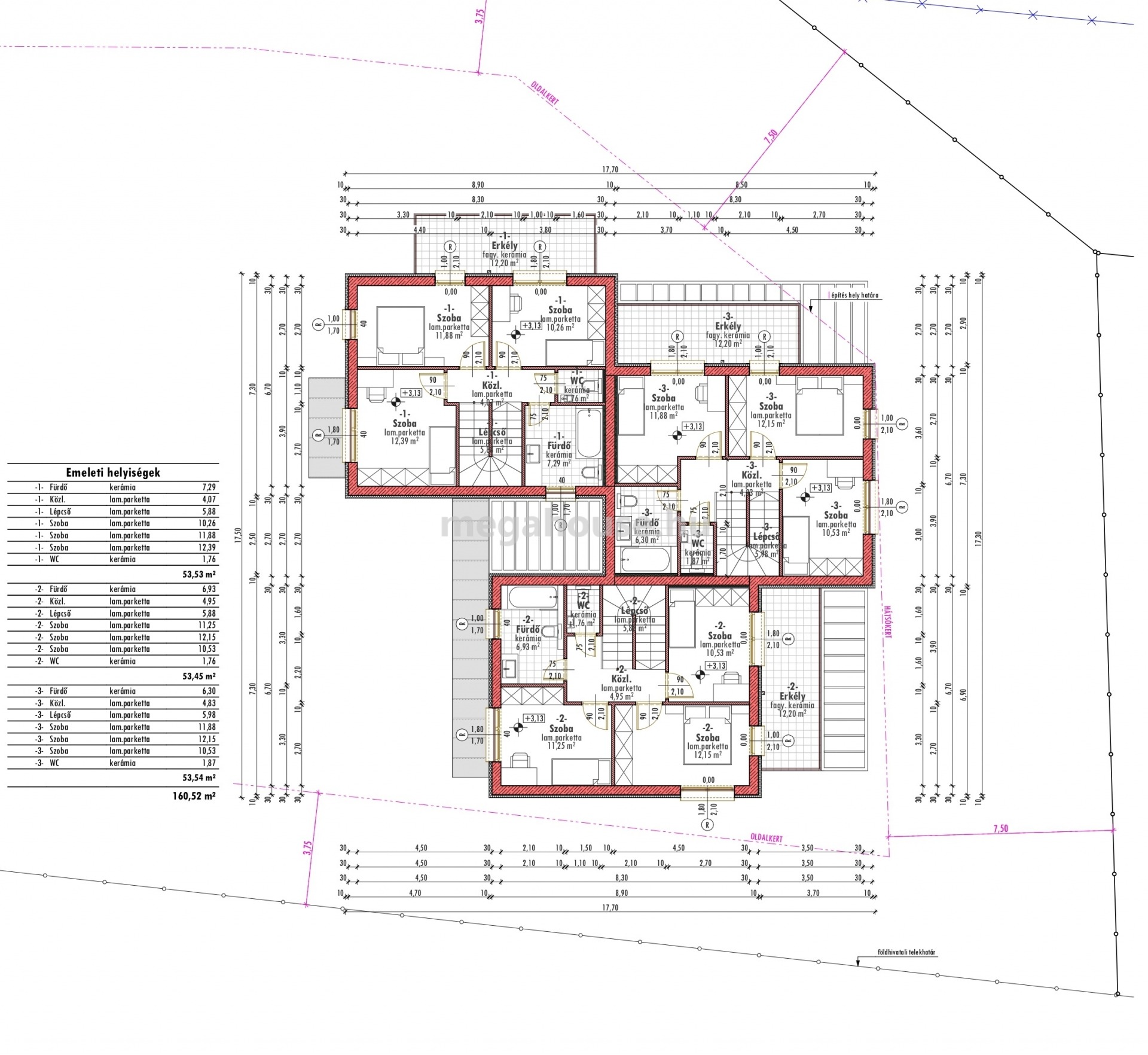 A FELSŐ SZINTEN 3db hálószoba, a második fürdőszoba és külön wc található. 2db hálószobából egy 12nm-es erkély nyílik.