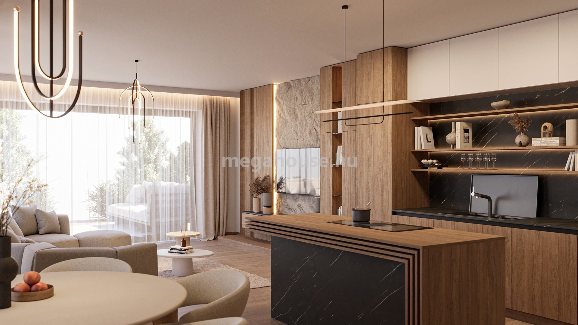 Az ingatlant egy kényelmes méretű előszobán keresztül közelíthetjük meg. Innen nyílik egy hatalmas terekkel rendelkező, napfényes amerikai konyhás/étkezős nappali, melyhez kapcsolódik egy 19 nm-es, jól hasznosítható fedett terasz, azon túl pedig az 550 nm-es kert. Szintén az előszobából nyílik egy vendég mosdó, valamint a két állásos, tágas garázs is.