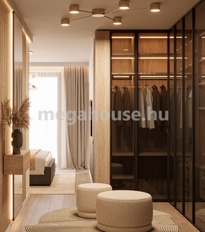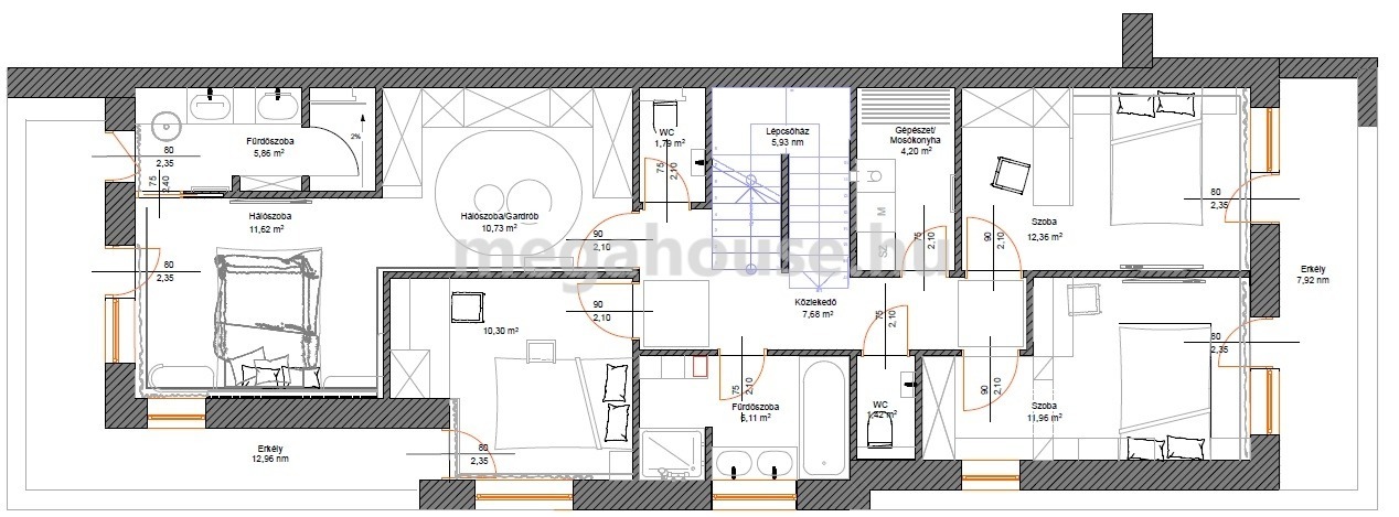 A ház emeletén található a szülői traktus, melyet egy 11 nm-es walk-in gardróbon keresztül közelíthetünk meg. A tágas, 12 nm-es hálóhoz kapcsolódik egy privát, zuhanyszós fürdőszoba, valamint egy 13 nm-es erkély is.