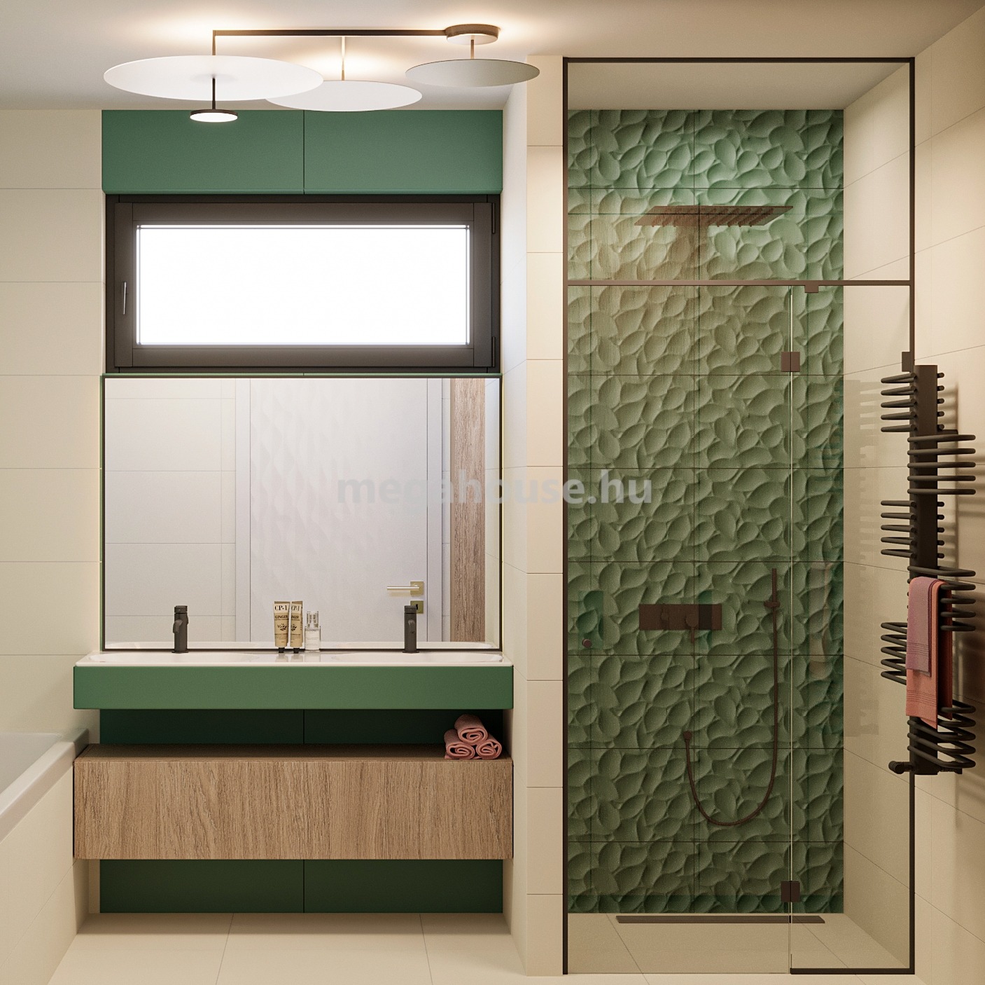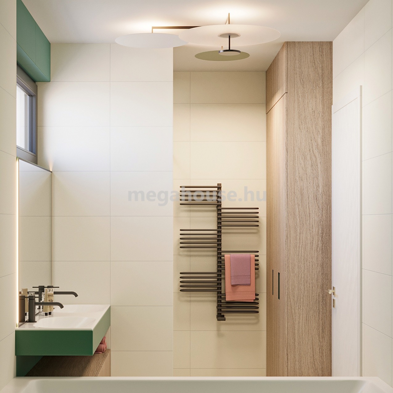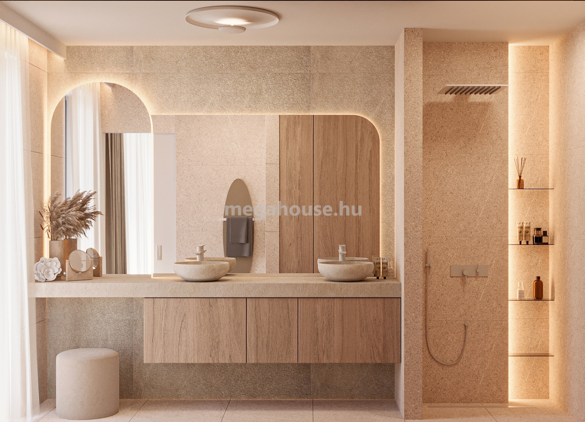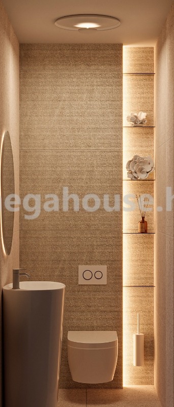 Ezen a szinten további 3, szintén erkély kapcsolatos hálószoba, káddal és zuhanyzóval is felszerelt fürdőszoba, mosó és háztartási helyiség valamint 2 mosdó is helyet kap.
