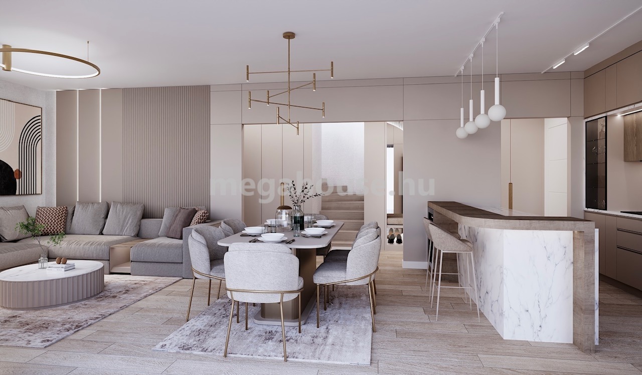 A NY-i tájolású amerikai konyhás nappali nagy üvegfelületekkel rendelkezik. A félig fedett terasz 15 nm nagyságú, innen léphetünk majd ki a gyönyörűen kiépített kertbe. A földszinten egy dolgozószoba, kamra és vendég mosdó kapott helyet.