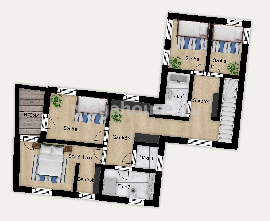 A FELSŐ SZINTEN 4 hálószoba, két fürdőszoba , háztartási helyiség, gardrob, és két szobához kapcsolódó csendes fekvésű terasz található. A masterbedroom saját gardróbos és fürdőszobás és erkélyes.
