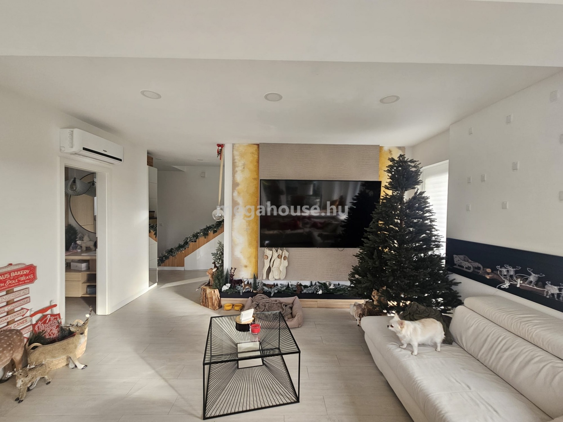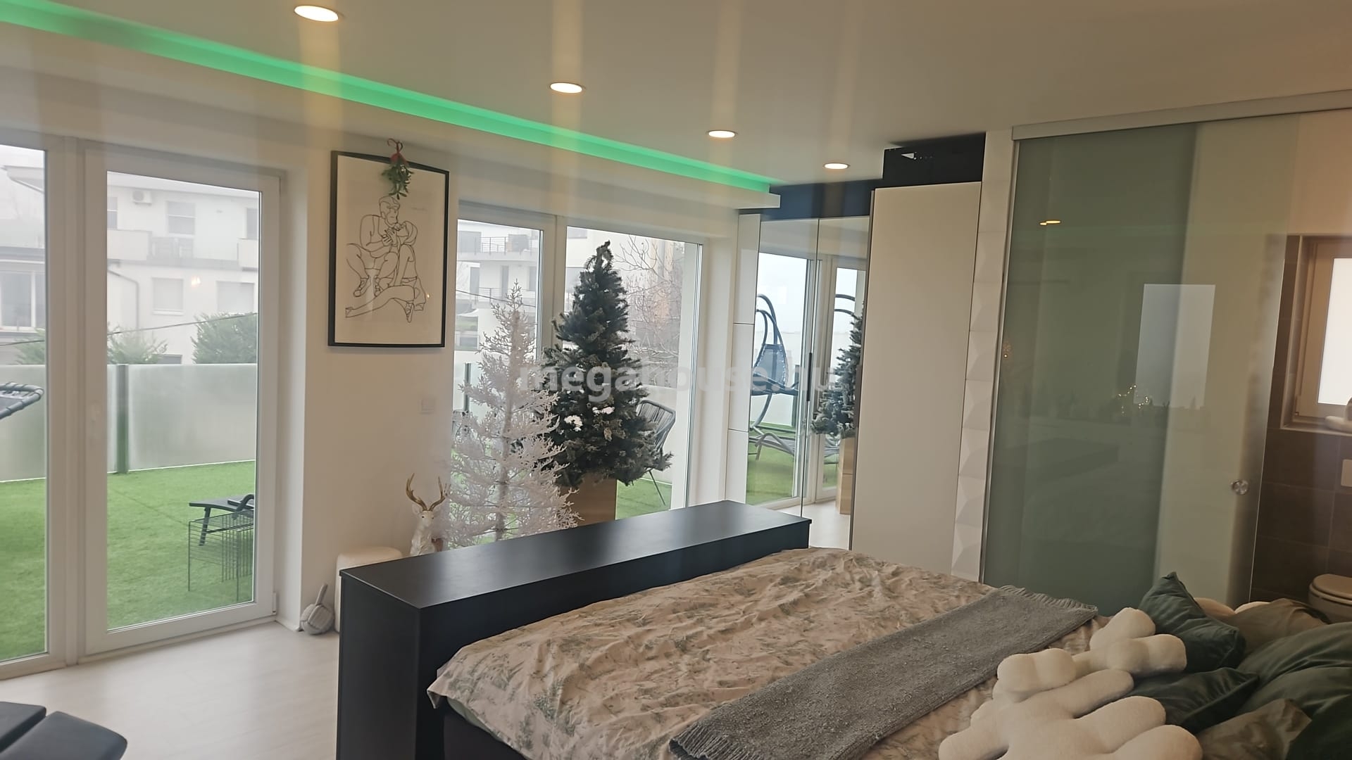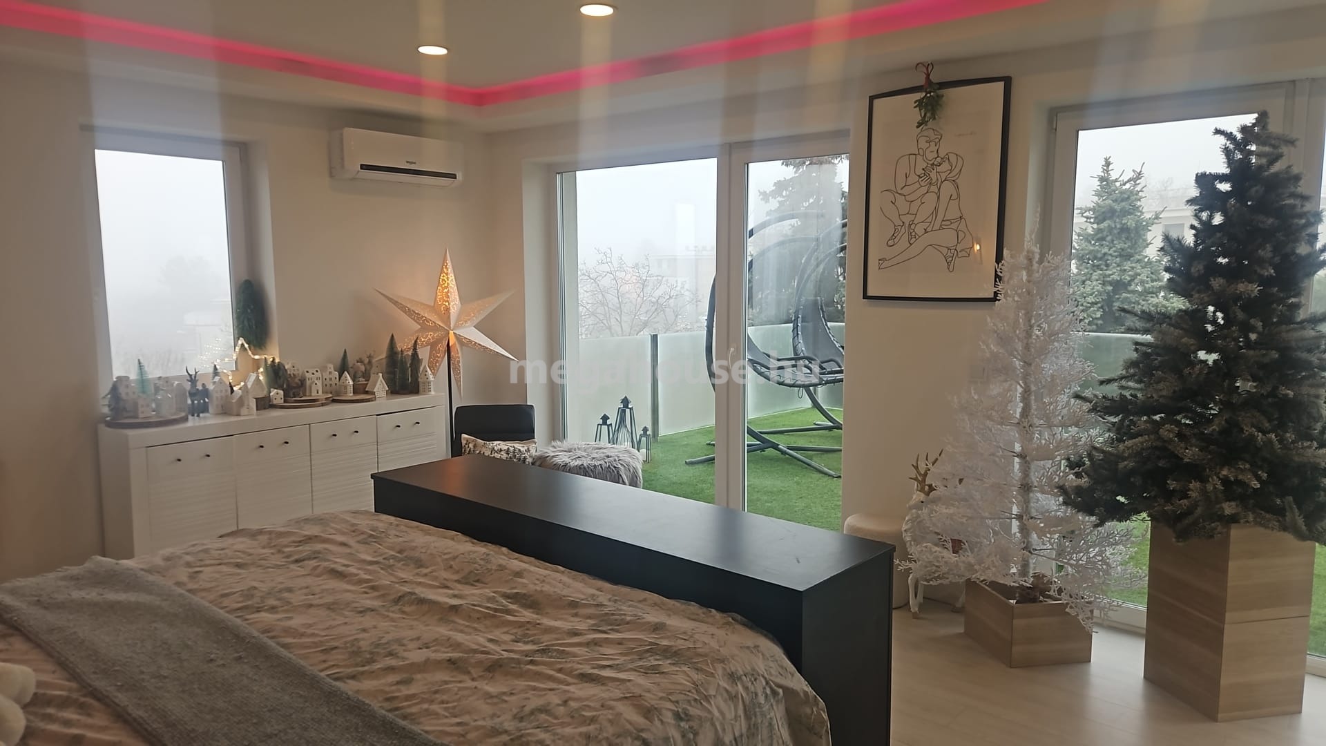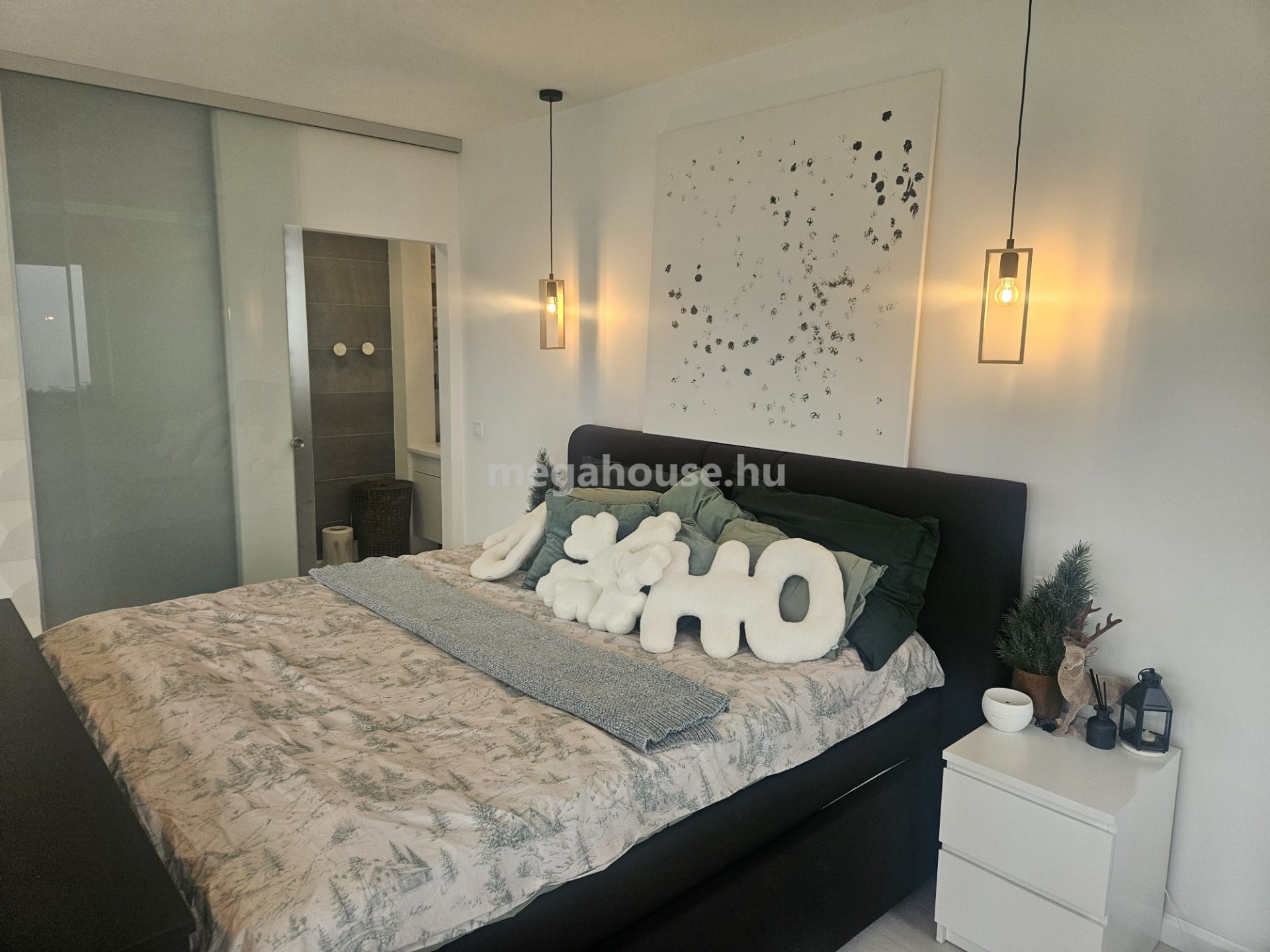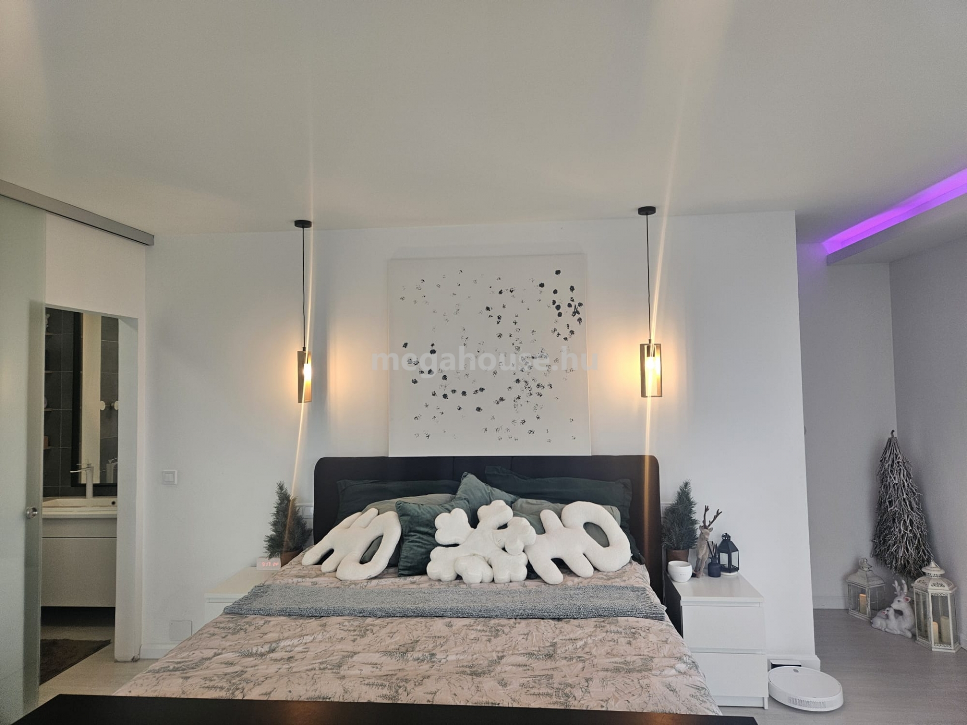 Felső szinten a nagyméretű hálószoba, gardrób-szekrénysorral és épített zuhanyzós fürdőszobával, innen nyílik nagy és panorámás tetőterasz ami 34 m2-es, nagyon hangulatos és különleges.
