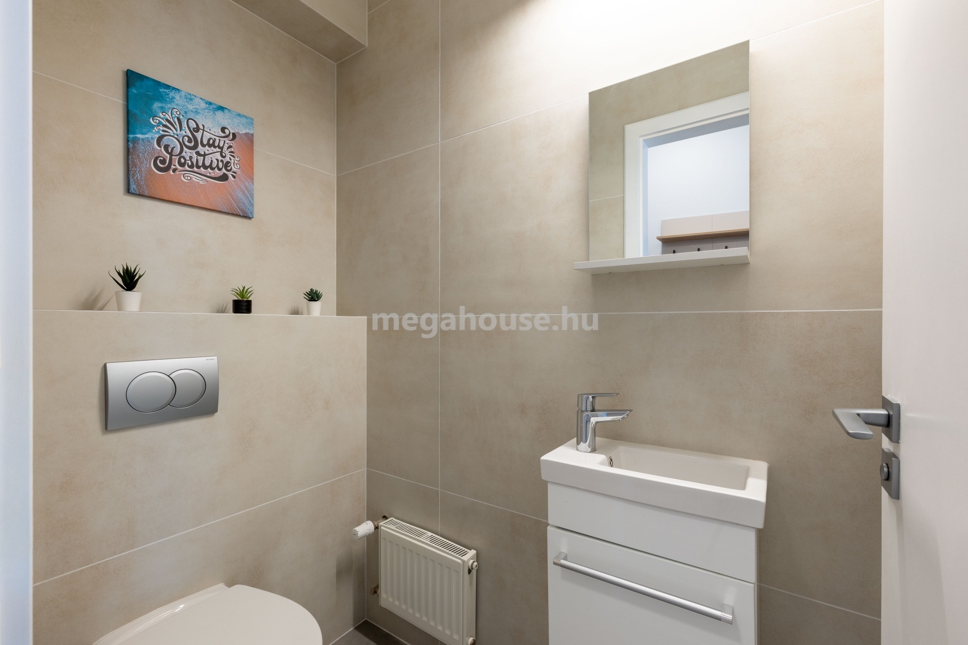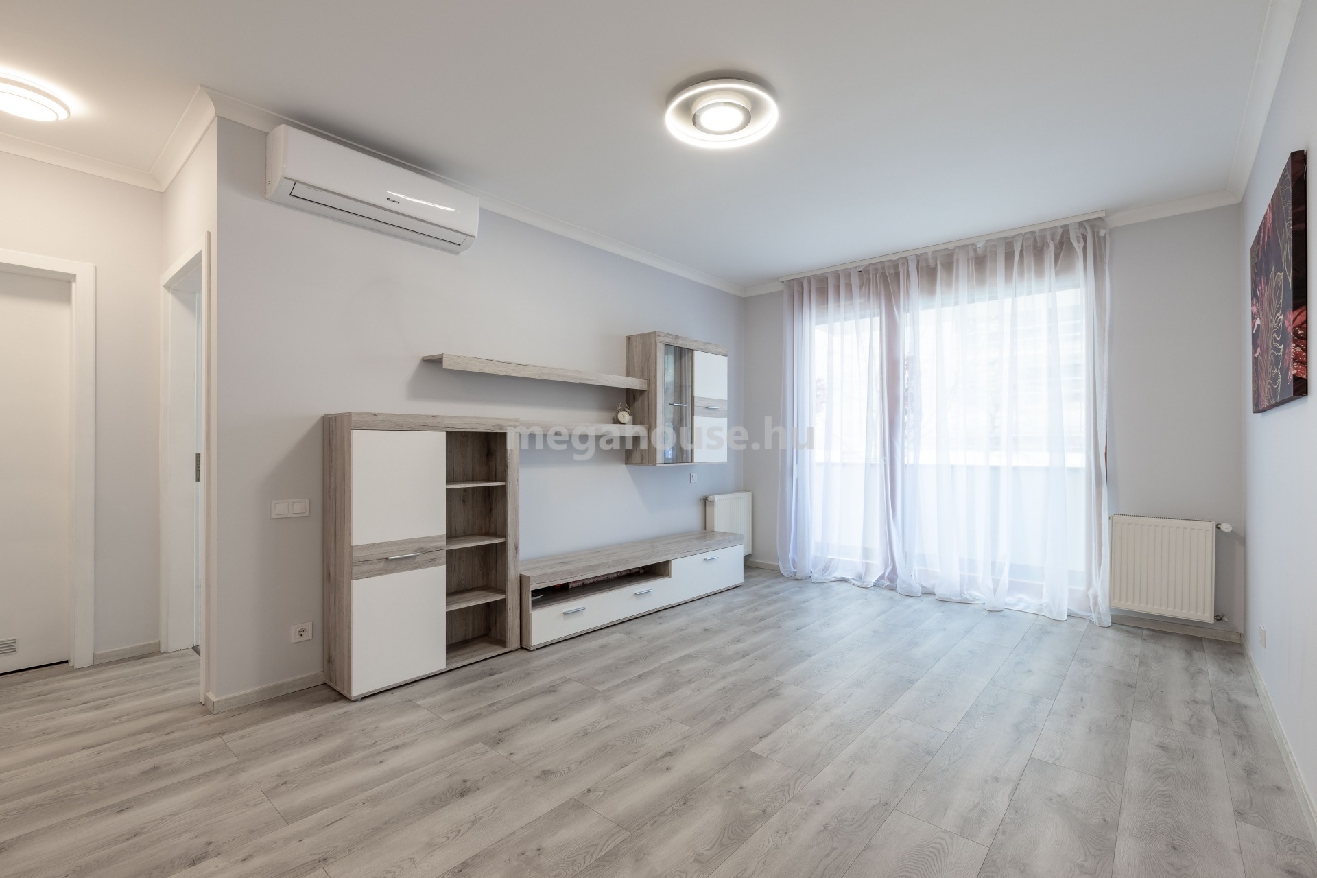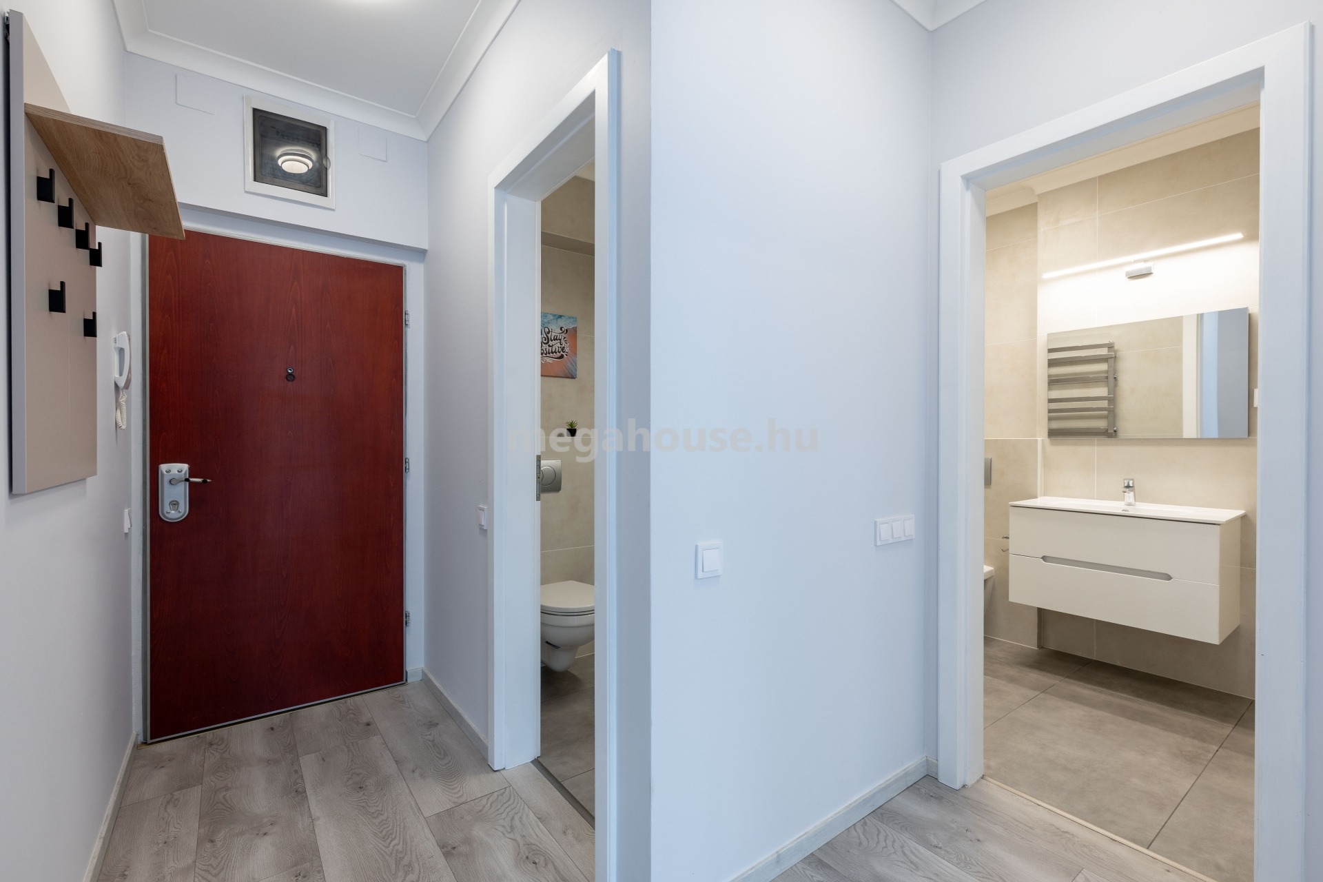 A biztonságos és szépen karbantartott, napfényes lépcsőházból az előszobába érkezünk, ahonnan bal kéz felől külön helyiségben a vendég WC, majd a kádas fürdőszoba található. A lakás központi részén a közvetlen teraszkapcsolattal rendelkező amerikai konyhás nappali áll. A nappali két oldalán elhelyezkedő szobák jó méretűek és remekül bútorozhatóak. A fürdőszoba melletti hálószoba teraszkapcsolatos.