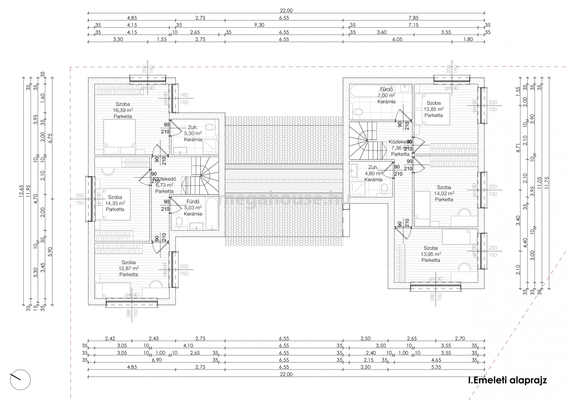 Az emeleten három külön nyíló hálószoba került kialakításra 13 m², 14 m² és 16 m² közötti méretekkel, valamint közlekedő, külön zuhanyzó és fürdőszoba biztosítja a kényelmes családi életteret.