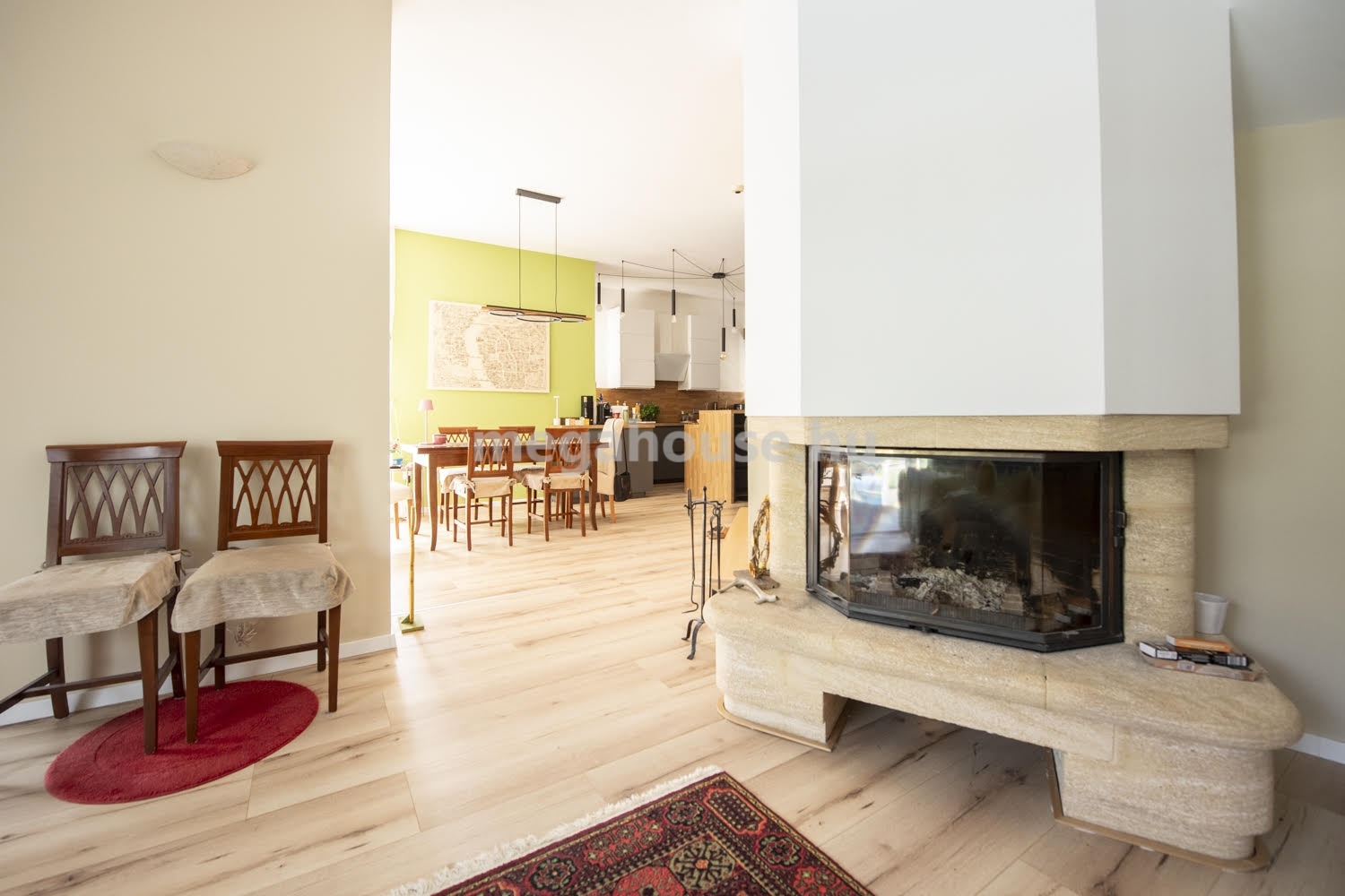 A ház nagyon jó elosztású. A földszinten található egy teljeskörűen felújított és gépesített konyha, mellette egy kényelmes étkező helyiség, azon túl pedig egy gyönyörű kandallóval felszerelt, nagy belmagasságú, impozáns nappali. Innen nyílik a 15 nm-es napellenzővel felszerelt terasz, ahonnan a szépen gondozott, öntözőrendszerrel ellátott, örökzöldekkel beültetett intim kertbe érünk.