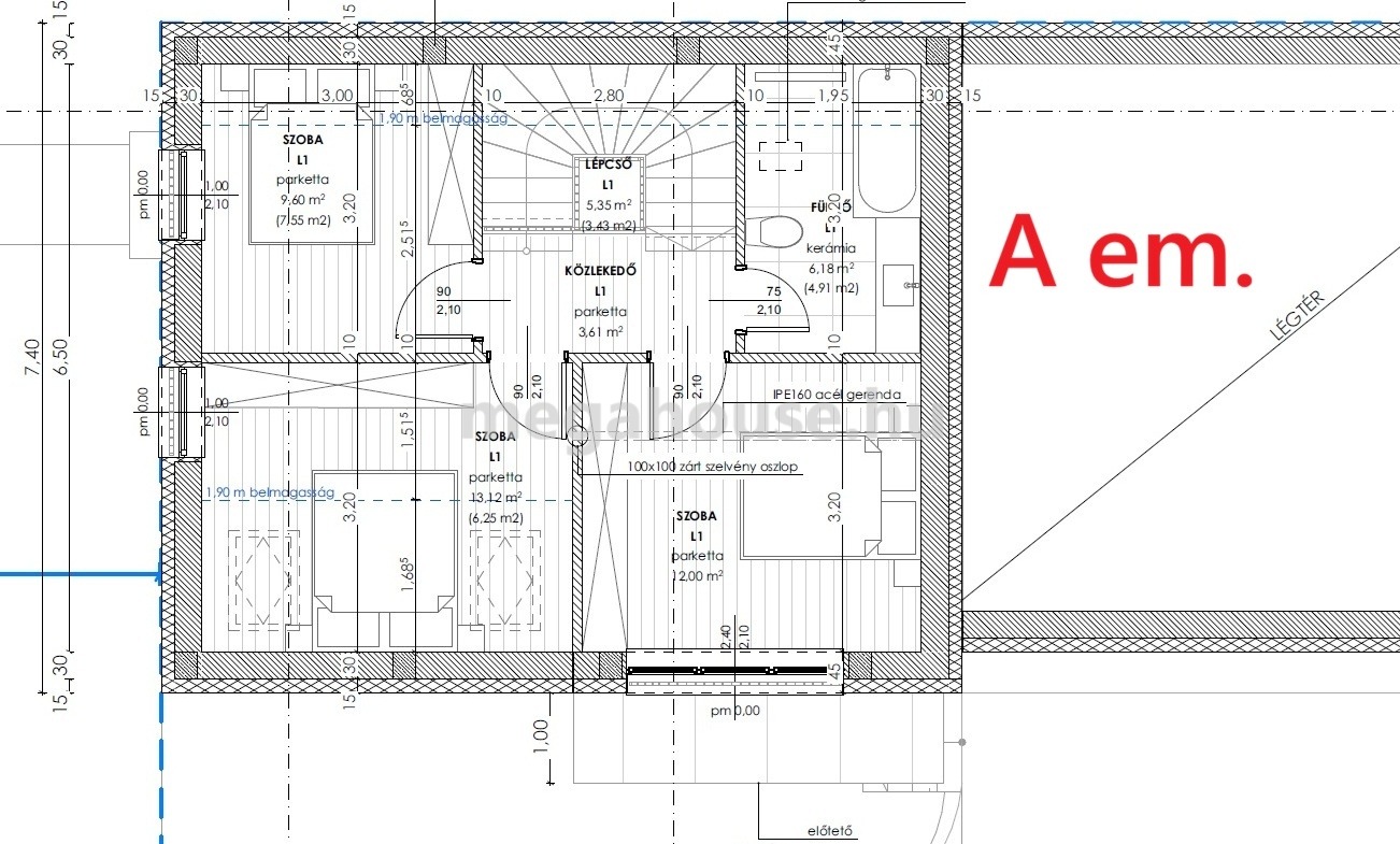 A gépkocsi beálló tetőtere beépíthető a kedvező belmagasság révén kb. 20 nm.